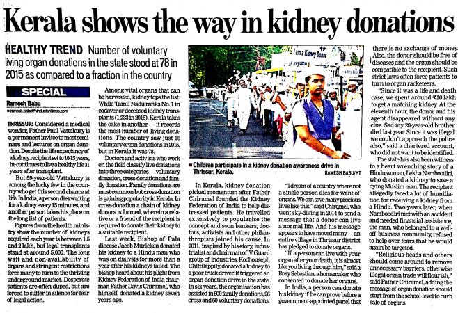 - Industrialist and humanitarian, Kochouseph Chitilappilly(founder of V-Guard Industries and Wonderla Amusement Parks) donated one of his kidneys to a stranger.(2) a Priest, Father davis Chiramel followed suit by donating his kidney. These two donations which were entirely altruistic in intention caught the imagination and attention of Kerala, to form the fulcrum of a rejuvenated organ transplantation scenario in the state. People realized the existence of an option, though complex, technically demanding and manpower and man-hours intensive, and safe conduct of the same for patients with end-stage organ failure. These two gentlemen are now referred to as ‘organ evangelists’. Since then, it seemed as though organ donation will never lose the newfound impetus within a reluctant Kerala. Many specialized hospitals offered transplantation, most of them being living related transplants. Thanks to the ‘evangelists’, the number of organ donors shot up from 19 in 2012 to 76 in 2015. Though a change for the better, the ideal remained cadaveric transplantation, which somehow refused to take off in Kerala.